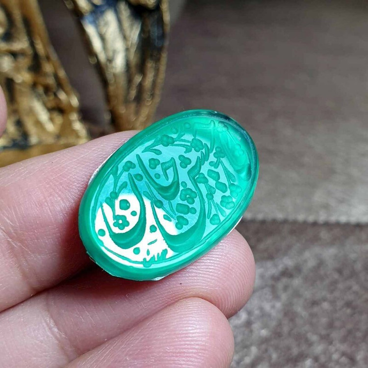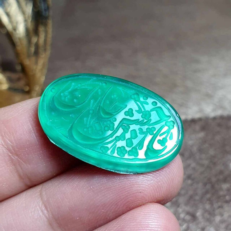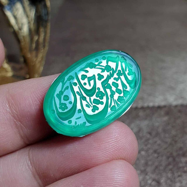 نگین عقیق سبز معدنی با خط زیبای دست امضا دار کد 25808